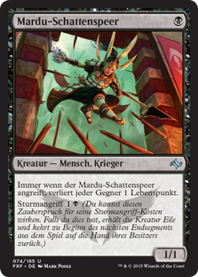 | Rules | Whenever Mardu Shadowspear attacks, each opponent loses 1 life. Dash (You may cast this spell for its dash cost. If you do, it gains haste, and it's returned from the battlefield to its owner's hand at the beginning of the next end step.) |