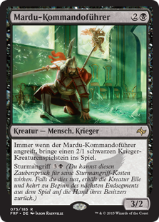 | Rules | Whenever Mardu Strike Leader attacks, create a 2/1 black Warrior creature token. Dash (You may cast this spell for its dash cost. If you do, it gains haste, and it's returned from the battlefield to its owner's hand at the beginning of the next end step.) |