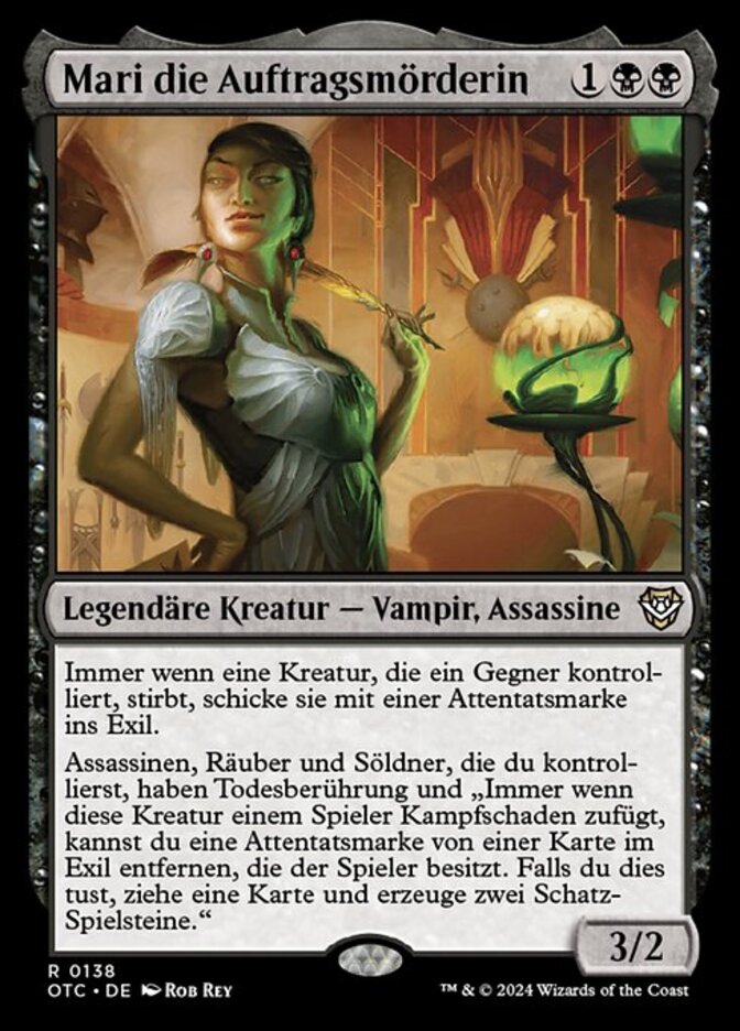 | Rules | Whenever a creature an opponent controls dies, exile it with a hit counter on it. Assassins, Mercenaries, and Rogues you control have deathtouch and "Whenever this creature deals combat damage to a player, you may remove a hit counter from a card that player owns in exile. If you do, draw a card and create two Treasure tokens." |