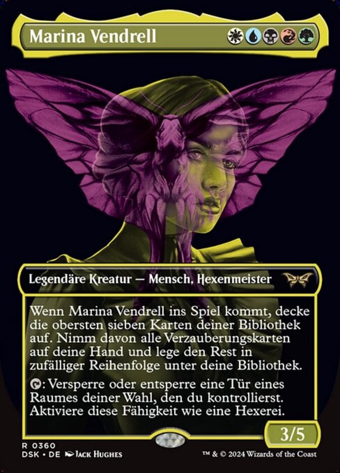 | Rules | When Marina Vendrell enters, reveal the top seven cards of your library. Put all enchantment cards from among them into your hand and the rest on the bottom of your library in a random order. : Lock or unlock a door of target Room you control. Activate only as a sorcery. |