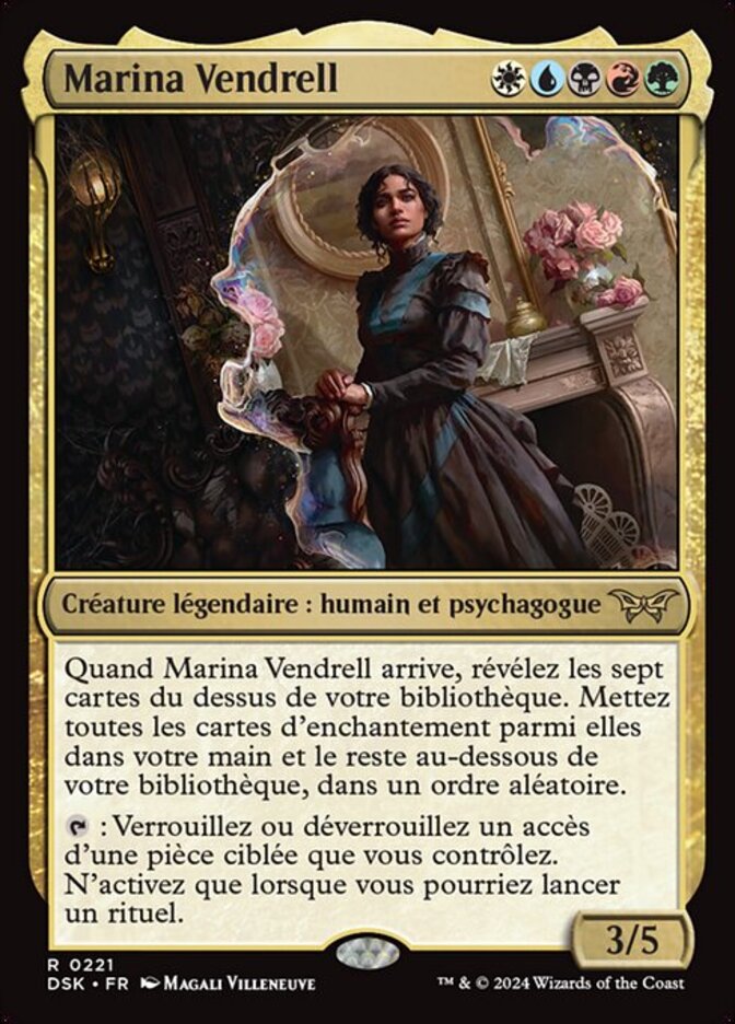 | Rules | When Marina Vendrell enters, reveal the top seven cards of your library. Put all enchantment cards from among them into your hand and the rest on the bottom of your library in a random order. : Lock or unlock a door of target Room you control. Activate only as a sorcery. |