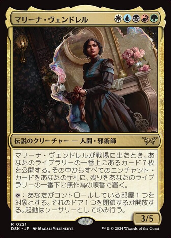 | Rules | When Marina Vendrell enters, reveal the top seven cards of your library. Put all enchantment cards from among them into your hand and the rest on the bottom of your library in a random order. : Lock or unlock a door of target Room you control. Activate only as a sorcery. |