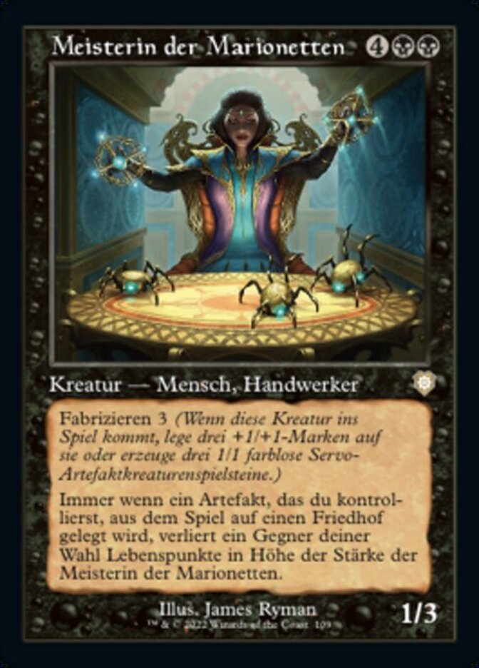 | Rules | Fabricate 3 (When this creature enters the battlefield, put three +1/+1 counters on it or create three 1/1 colorless Servo artifact creature tokens.) Whenever an artifact you control is put into a graveyard from the battlefield, target opponent loses life equal to Marionette Master's power. |