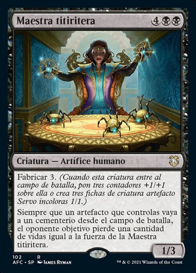 | Rules | Fabricate 3 (When this creature enters the battlefield, put three +1/+1 counters on it or create three 1/1 colorless Servo artifact creature tokens.) Whenever an artifact you control is put into a graveyard from the battlefield, target opponent loses life equal to Marionette Master's power. |