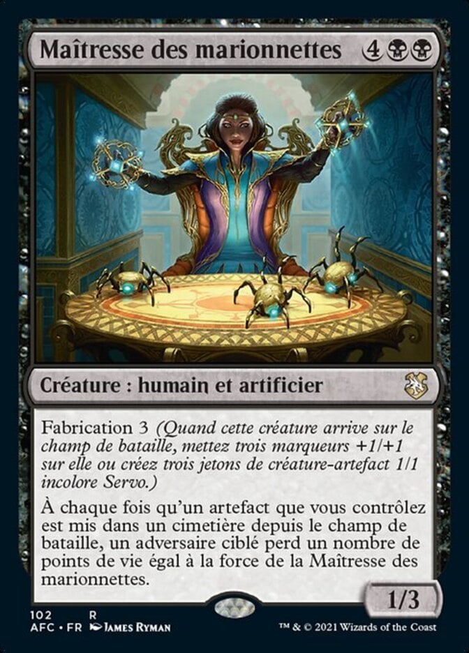 | Rules | Fabricate 3 (When this creature enters the battlefield, put three +1/+1 counters on it or create three 1/1 colorless Servo artifact creature tokens.) Whenever an artifact you control is put into a graveyard from the battlefield, target opponent loses life equal to Marionette Master's power. |