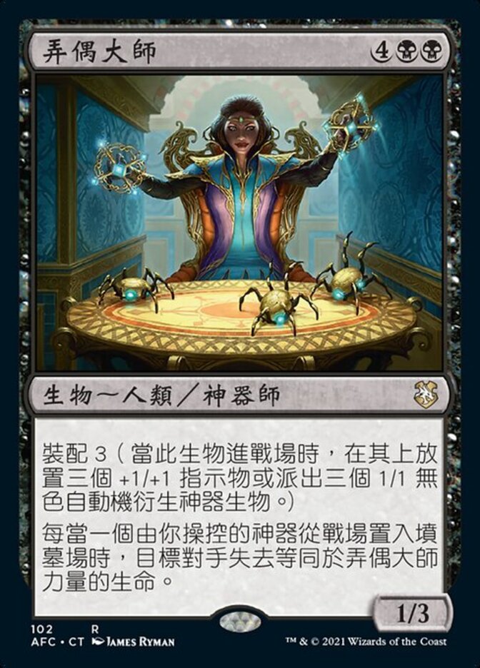 | Rules | Fabricate 3 (When this creature enters the battlefield, put three +1/+1 counters on it or create three 1/1 colorless Servo artifact creature tokens.) Whenever an artifact you control is put into a graveyard from the battlefield, target opponent loses life equal to Marionette Master's power. |