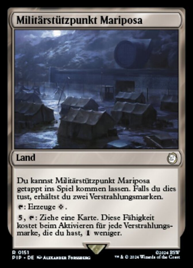 | Rules | You may have Mariposa Military Base enter the battlefield tapped. If you do, you get two rad counters. : Add . , : Draw a card. This ability costs less to activate for each rad counter you have. |
