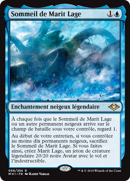 | Rules | Whenever Marit Lage's Slumber or another snow permanent enters the battlefield under your control, scry 1. At the beginning of your upkeep, if you control ten or more snow permanents, sacrifice Marit Lage's Slumber. If you do, create Marit Lage, a legendary 20/20 black Avatar creature token with flying and indestructible. |