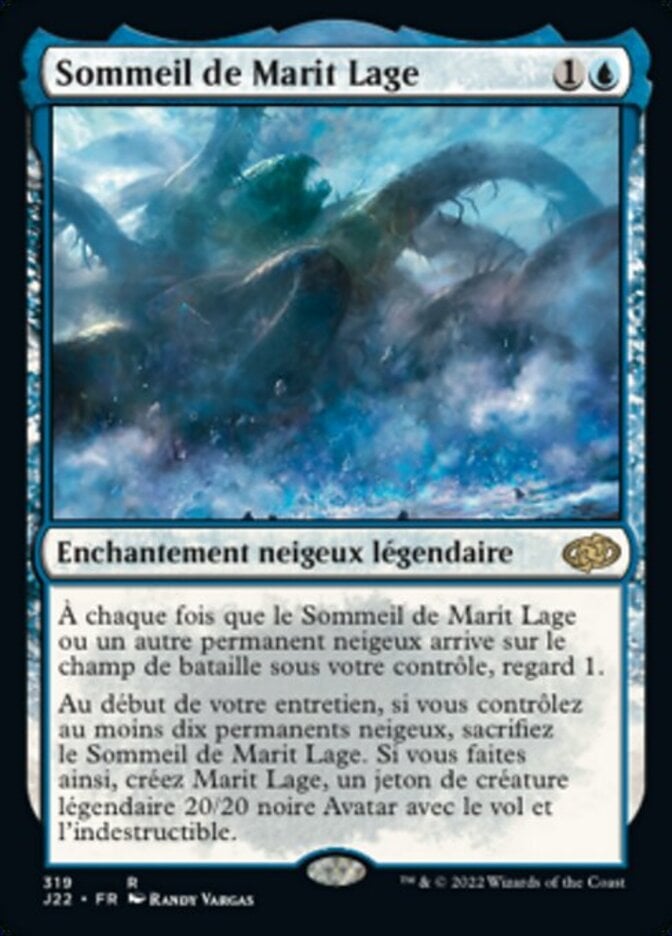 | Rules | Whenever Marit Lage's Slumber or another snow permanent enters the battlefield under your control, scry 1. At the beginning of your upkeep, if you control ten or more snow permanents, sacrifice Marit Lage's Slumber. If you do, create Marit Lage, a legendary 20/20 black Avatar creature token with flying and indestructible. |
