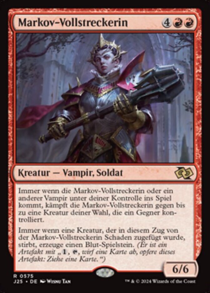 | Rules | Whenever Markov Enforcer or another Vampire enters the battlefield under your control, Markov Enforcer fights up to one target creature an opponent controls. Whenever a creature dealt damage by Markov Enforcer this turn dies, create a Blood token. (It's an artifact with ", , Discard a card, Sacrifice this artifact: Draw a card.") |