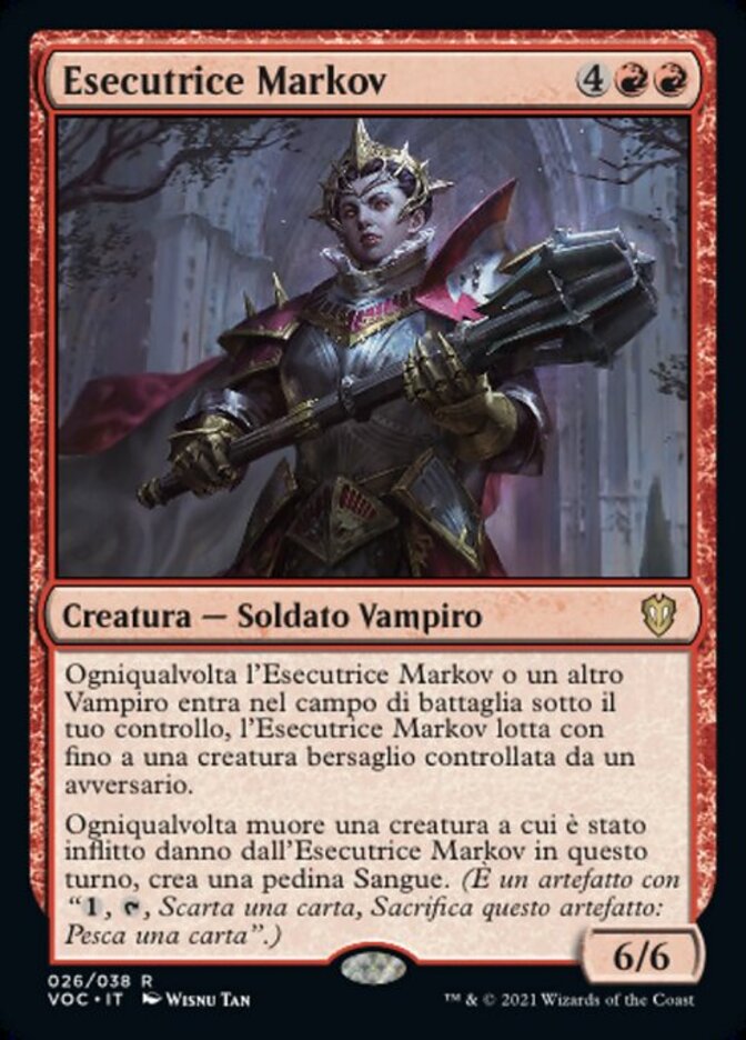 | Rules | Whenever Markov Enforcer or another Vampire enters the battlefield under your control, Markov Enforcer fights up to one target creature an opponent controls. Whenever a creature dealt damage by Markov Enforcer this turn dies, create a Blood token. (It's an artifact with ", , Discard a card, Sacrifice this artifact: Draw a card.") |