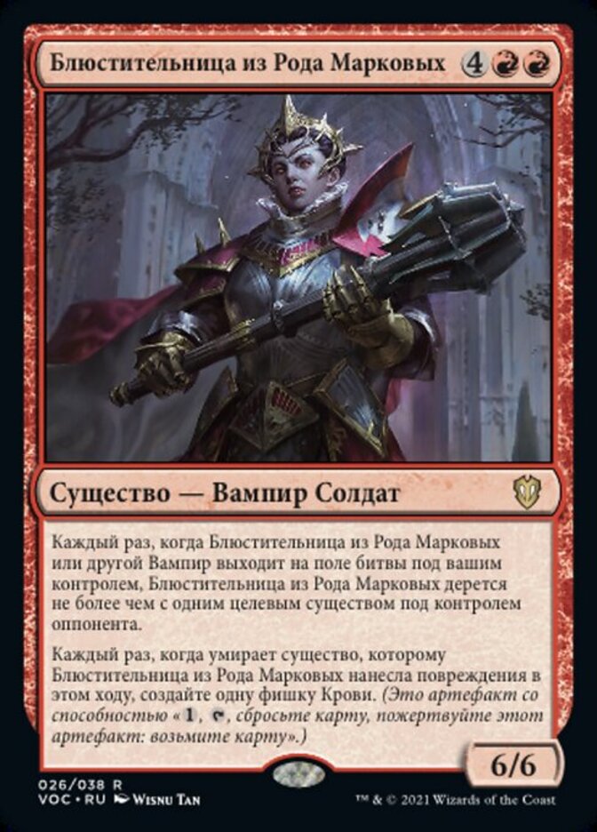 | Rules | Whenever Markov Enforcer or another Vampire enters the battlefield under your control, Markov Enforcer fights up to one target creature an opponent controls. Whenever a creature dealt damage by Markov Enforcer this turn dies, create a Blood token. (It's an artifact with ", , Discard a card, Sacrifice this artifact: Draw a card.") |