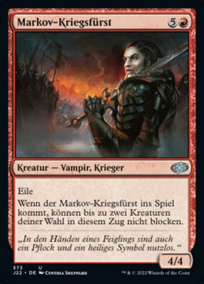| Rules | Haste When Markov Warlord enters the battlefield, up to two target creatures can't block this turn. |