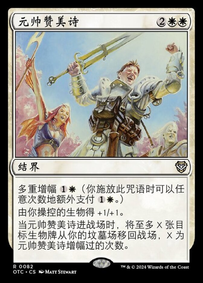 | Rules | Multikicker (You may pay an additional any number of times as you cast this spell.) Creatures you control get +1/+1. When Marshal's Anthem enters the battlefield, return up to X target creature cards from your graveyard to the battlefield, where X is the number of times Marshal's Anthem was kicked. |