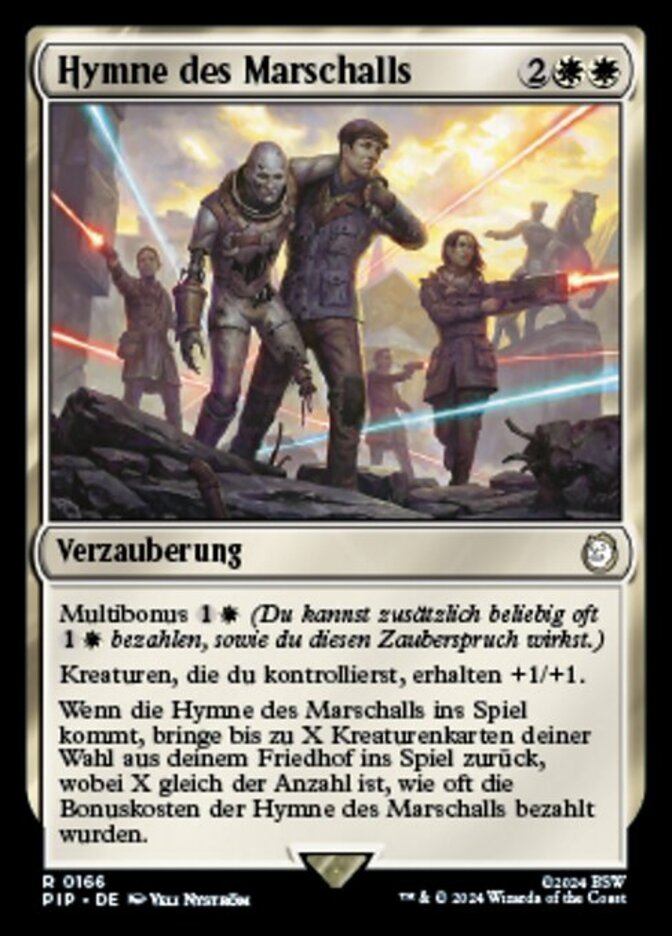 | Rules | Multikicker (You may pay an additional any number of times as you cast this spell.) Creatures you control get +1/+1. When Marshal's Anthem enters the battlefield, return up to X target creature cards from your graveyard to the battlefield, where X is the number of times Marshal's Anthem was kicked. |