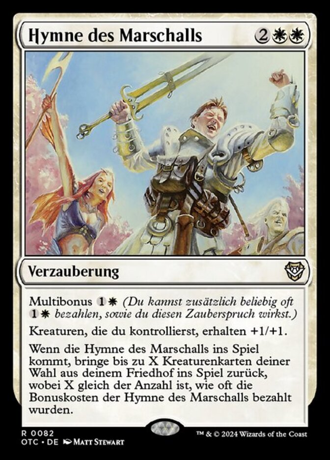 | Rules | Multikicker (You may pay an additional any number of times as you cast this spell.) Creatures you control get +1/+1. When Marshal's Anthem enters the battlefield, return up to X target creature cards from your graveyard to the battlefield, where X is the number of times Marshal's Anthem was kicked. |