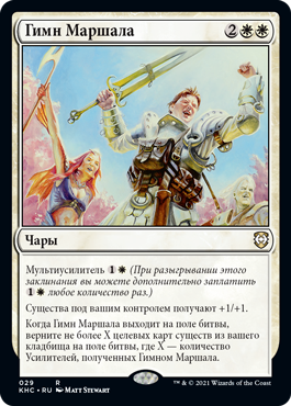 | Rules | Multikicker (You may pay an additional any number of times as you cast this spell.) Creatures you control get +1/+1. When Marshal's Anthem enters the battlefield, return up to X target creature cards from your graveyard to the battlefield, where X is the number of times Marshal's Anthem was kicked. |