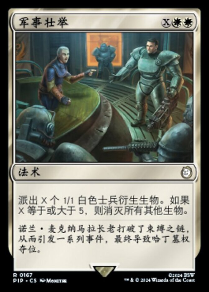 | Rules | Create X 1/1 white Soldier creature tokens. If X is 5 or more, destroy all other creatures. |