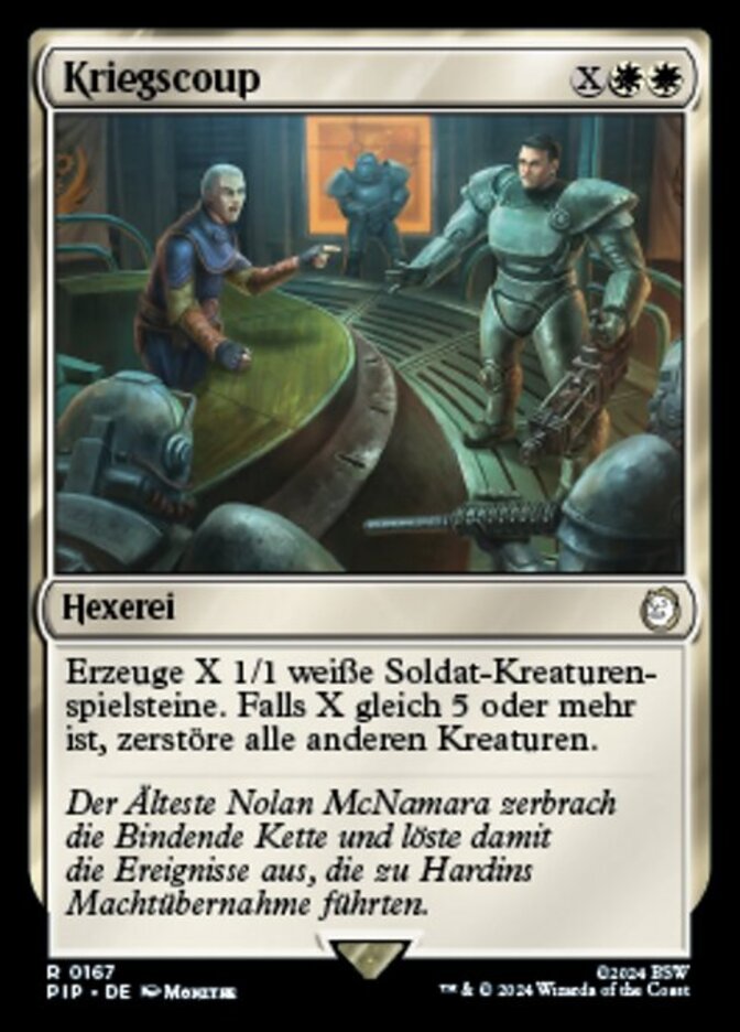 | Rules | Create X 1/1 white Soldier creature tokens. If X is 5 or more, destroy all other creatures. |