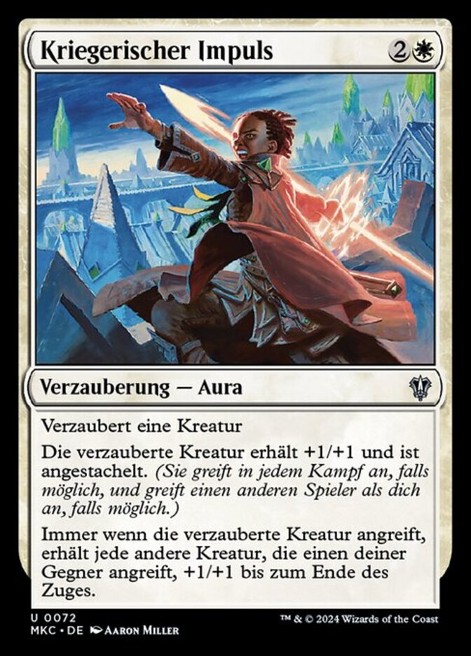 | Rules | Enchant creature Enchanted creature gets +1/+1 and is goaded. (It attacks each combat if able and attacks a player other than you if able.) Whenever enchanted creature attacks, each other creature that's attacking one of your opponents gets +1/+1 until end of turn. |