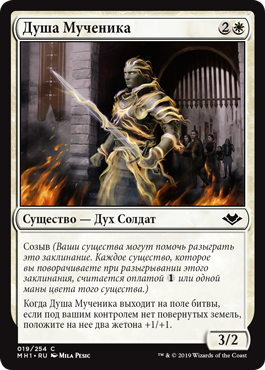 | Rules | Convoke (Your creatures can help cast this spell. Each creature you tap while casting this spell pays for or one mana of that creature's color.) When Martyr's Soul enters the battlefield, if you control no tapped lands, put two +1/+1 counters on it. |