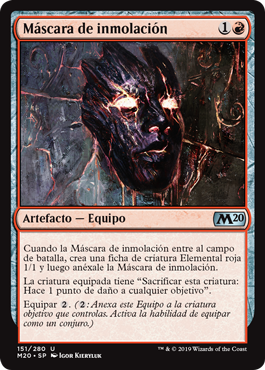 | Rules | When Mask of Immolation enters the battlefield, create a 1/1 red Elemental creature token, then attach Mask of Immolation to it. Equipped creature has "Sacrifice this creature: It deals 1 damage to any target." Equip (: Attach to target creature you control. Equip only as a sorcery.) |