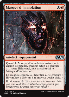 | Rules | When Mask of Immolation enters the battlefield, create a 1/1 red Elemental creature token, then attach Mask of Immolation to it. Equipped creature has "Sacrifice this creature: It deals 1 damage to any target." Equip (: Attach to target creature you control. Equip only as a sorcery.) |