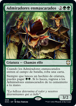 | Rules | When Masked Admirers enters the battlefield, draw a card. Whenever you cast a creature spell, you may pay . If you do, return Masked Admirers from your graveyard to your hand. |
