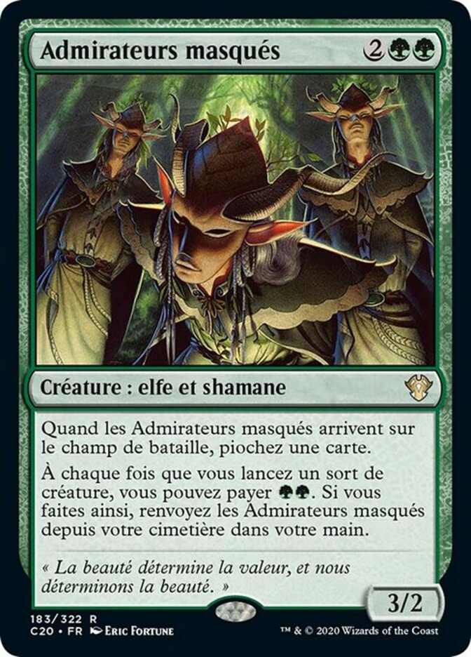| Rules | When Masked Admirers enters the battlefield, draw a card. Whenever you cast a creature spell, you may pay . If you do, return Masked Admirers from your graveyard to your hand. |