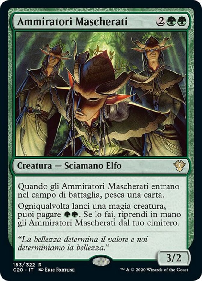 | Rules | When Masked Admirers enters the battlefield, draw a card. Whenever you cast a creature spell, you may pay . If you do, return Masked Admirers from your graveyard to your hand. |