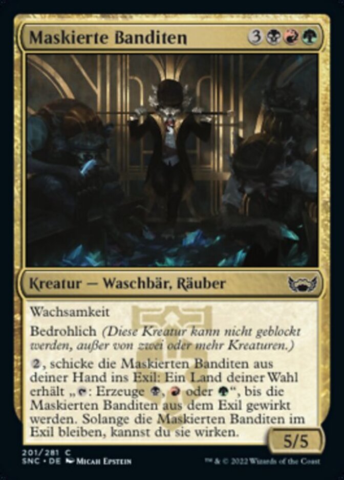 | Rules | Vigilance Menace (This creature can't be blocked except by two or more creatures.) , Exile Masked Bandits from your hand: Target land gains ": Add , , or " until Masked Bandits is cast from exile. You may cast Masked Bandits for as long as it remains exiled. |