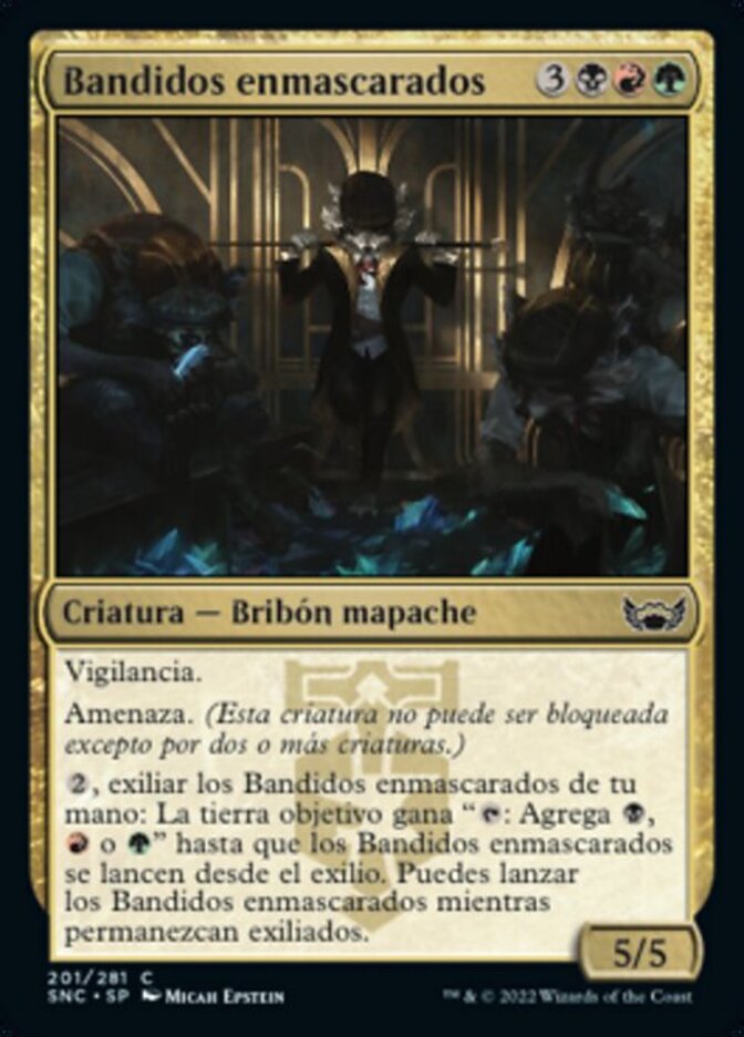 | Rules | Vigilance Menace (This creature can't be blocked except by two or more creatures.) , Exile Masked Bandits from your hand: Target land gains ": Add , , or " until Masked Bandits is cast from exile. You may cast Masked Bandits for as long as it remains exiled. |