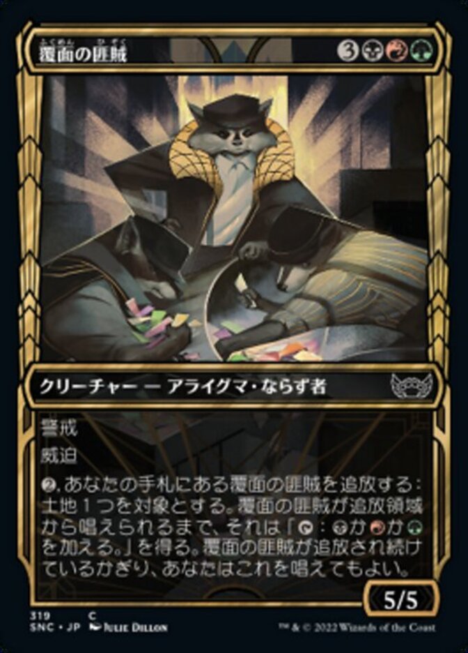 | Rules | Vigilance Menace (This creature can't be blocked except by two or more creatures.) , Exile Masked Bandits from your hand: Target land gains ": Add , , or " until Masked Bandits is cast from exile. You may cast Masked Bandits for as long as it remains exiled. |