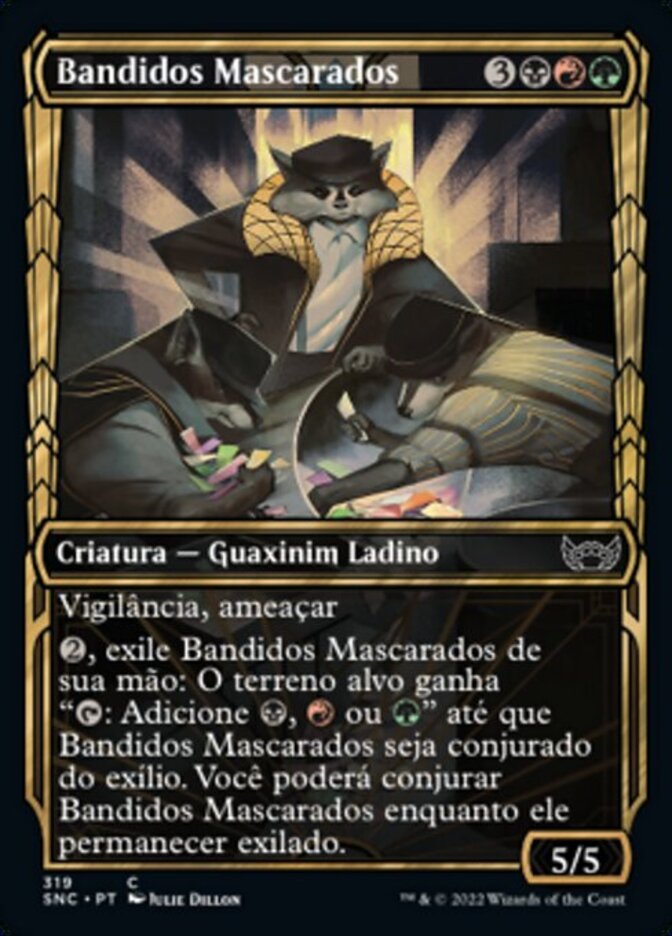 | Rules | Vigilance Menace (This creature can't be blocked except by two or more creatures.) , Exile Masked Bandits from your hand: Target land gains ": Add , , or " until Masked Bandits is cast from exile. You may cast Masked Bandits for as long as it remains exiled. |
