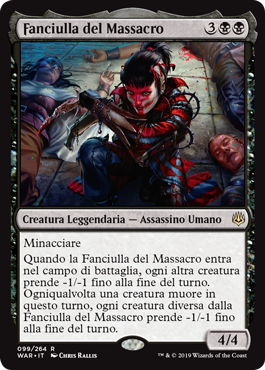 | Rules | Menace When Massacre Girl enters the battlefield, each other creature gets -1/-1 until end of turn. Whenever a creature dies this turn, each creature other than Massacre Girl gets -1/-1 until end of turn. |