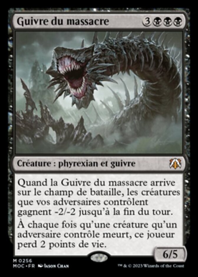 | Rules | When Massacre Wurm enters the battlefield, creatures your opponents control get -2/-2 until end of turn. Whenever a creature an opponent controls dies, that player loses 2 life. |