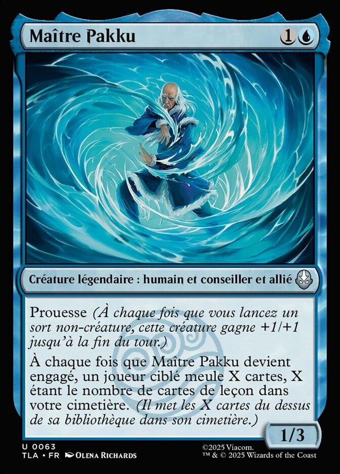 | Rules | Prowess (Whenever you cast a noncreature spell, this creature gets +1/+1 until end of turn.) Whenever Master Pakku becomes tapped, target player mills X cards, where X is the number of Lesson cards in your graveyard. (They put the top X cards of their library into their graveyard.) |