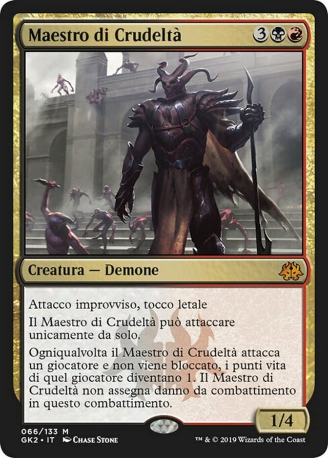 | Rules | First strike, deathtouch Master of Cruelties can only attack alone. Whenever Master of Cruelties attacks a player and isn't blocked, that player's life total becomes 1. Master of Cruelties assigns no combat damage this combat. |