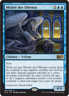 | Rules | Flying Whenever Master of Predicaments deals combat damage to a player, choose a card in your hand. That player guesses whether the card's mana value is greater than 4. If the player guessed wrong, you may cast the card without paying its mana cost. |