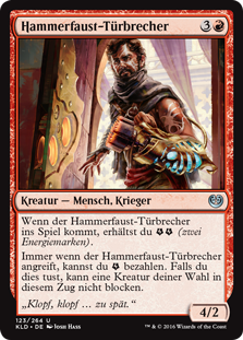 | Rules | When Maulfist Doorbuster enters the battlefield, you get (two energy counters). Whenever Maulfist Doorbuster attacks, you may pay . If you do, target creature can't block this turn. |