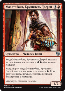 | Rules | When Maulfist Doorbuster enters the battlefield, you get (two energy counters). Whenever Maulfist Doorbuster attacks, you may pay . If you do, target creature can't block this turn. |