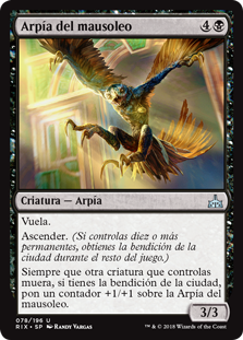 | Rules | Flying Ascend (If you control ten or more permanents, you get the city's blessing for the rest of the game.) Whenever another creature you control dies, if you have the city's blessing, put a +1/+1 counter on Mausoleum Harpy. |
