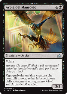 | Rules | Flying Ascend (If you control ten or more permanents, you get the city's blessing for the rest of the game.) Whenever another creature you control dies, if you have the city's blessing, put a +1/+1 counter on Mausoleum Harpy. |