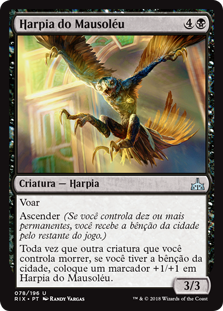 | Rules | Flying Ascend (If you control ten or more permanents, you get the city's blessing for the rest of the game.) Whenever another creature you control dies, if you have the city's blessing, put a +1/+1 counter on Mausoleum Harpy. |