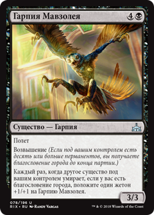 | Rules | Flying Ascend (If you control ten or more permanents, you get the city's blessing for the rest of the game.) Whenever another creature you control dies, if you have the city's blessing, put a +1/+1 counter on Mausoleum Harpy. |