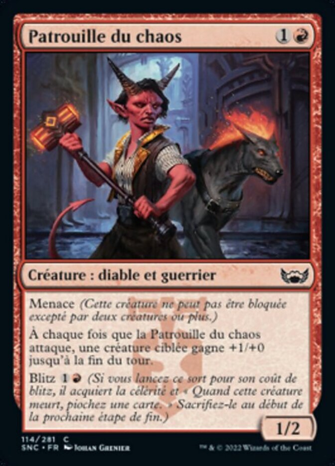 | Rules | Menace (This creature can't be blocked except by two or more creatures.) Whenever Mayhem Patrol attacks, target creature gets +1/+0 until end of turn. Blitz (If you cast this spell for its blitz cost, it gains haste and "When this creature dies, draw a card." Sacrifice it at the beginning of the next end step.) |
