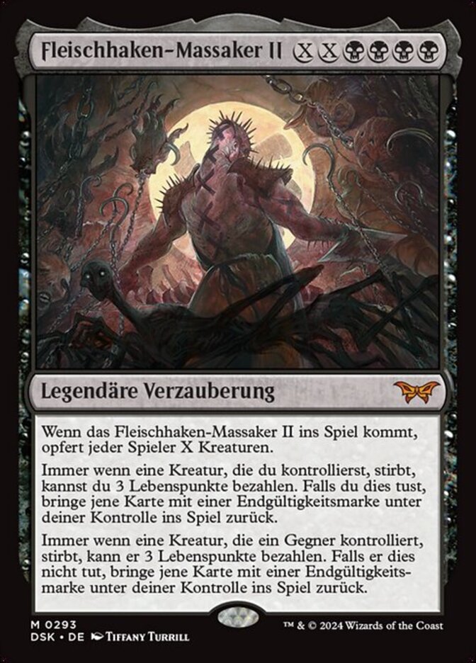 | Rules | When Meathook Massacre II enters, each player sacrifices X creatures. Whenever a creature you control dies, you may pay 3 life. If you do, return that card under your control with a finality counter on it. Whenever a creature an opponent controls dies, they may pay 3 life. If they don't, return that card under your control with a finality counter on it. |