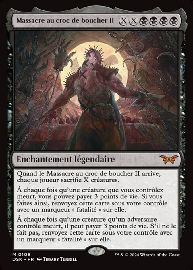 | Rules | When Meathook Massacre II enters, each player sacrifices X creatures. Whenever a creature you control dies, you may pay 3 life. If you do, return that card under your control with a finality counter on it. Whenever a creature an opponent controls dies, they may pay 3 life. If they don't, return that card under your control with a finality counter on it. |