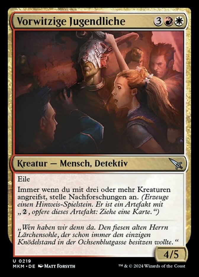 | Rules | Haste Whenever you attack with three or more creatures, investigate. (Create a Clue token. It's an artifact with ", Sacrifice this artifact: Draw a card.") |
