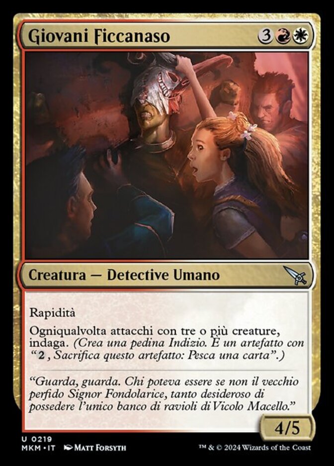 | Rules | Haste Whenever you attack with three or more creatures, investigate. (Create a Clue token. It's an artifact with ", Sacrifice this artifact: Draw a card.") |